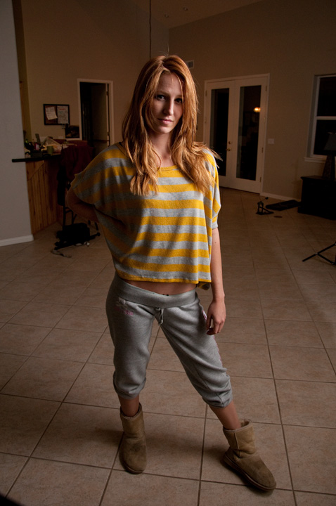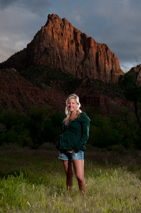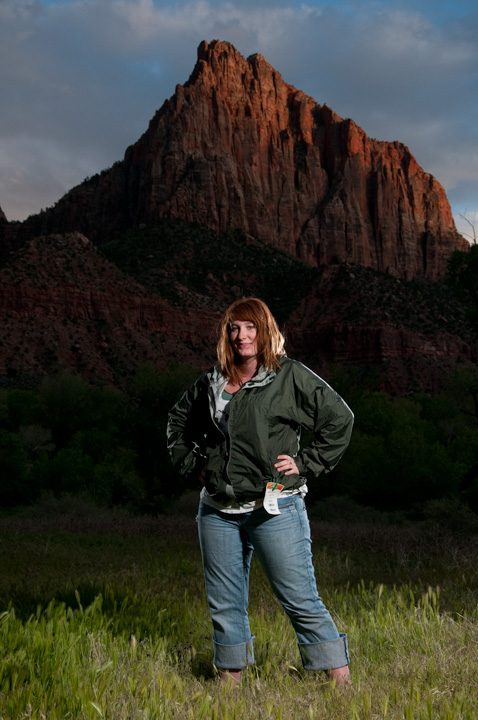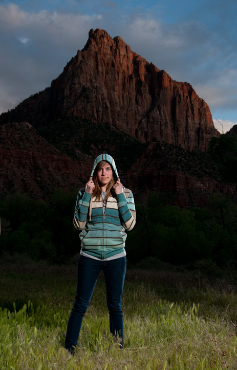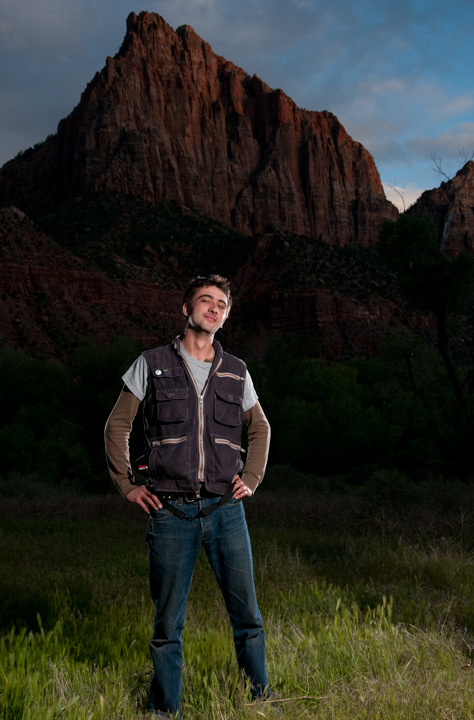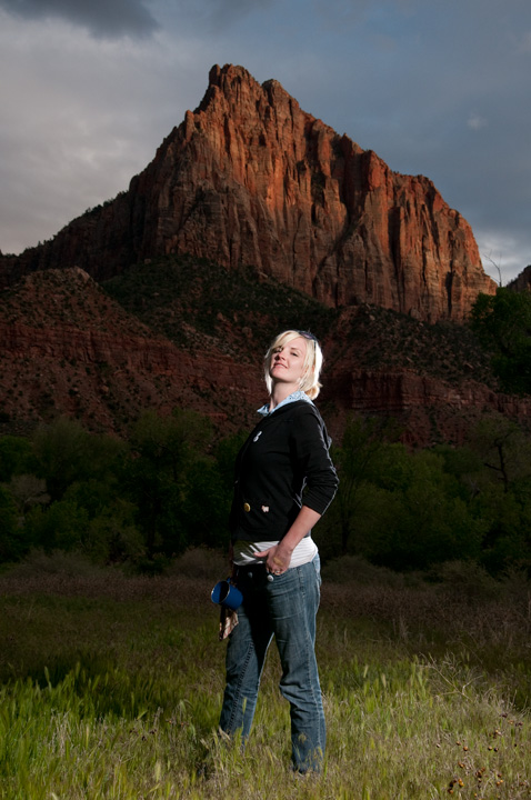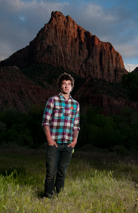 After arriving in Zion the next day and bumming around camp for a while, it was time to shoot once again. This time I wanted to utilize the natural beauty of the surrounding canyon to give the images a sense of place, since we had a bunch of lights and batteries with us, i went for a multi light set up and shot against the setting sun on a rock face across the road from our camp…