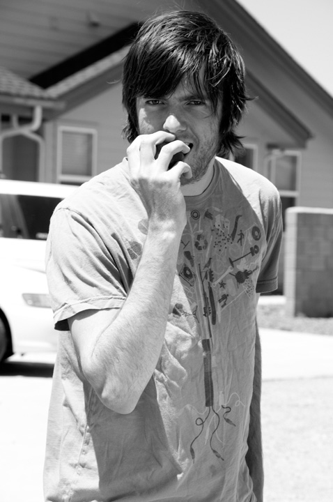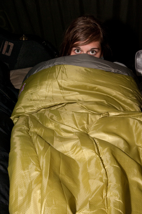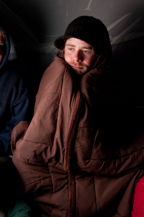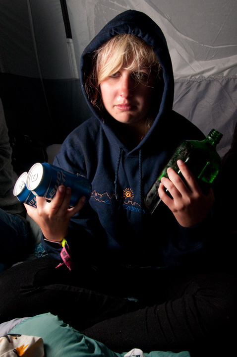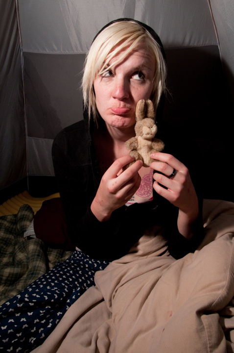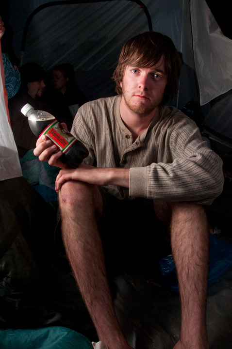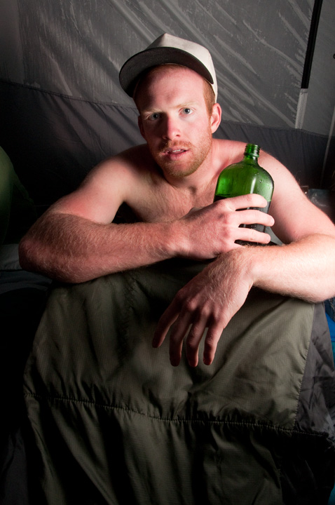 It rained….it started early in the morning but cleared up in the afternoon. However, by the time we returned to camp the rain did as well. Andrew, Matt and I cooked Crazy Campsite Cthulhu Colon Cleanser Chili in the rain; after which everyone proceded to huddle in their tents for the remainder of the soggy night. Needless to say this didn’t discourage me from shooting my beloved daily portraits. I got a little DIY with a trash bag for a light modifier and visited the tents to do my rounds. What follows is everyone in a various stage of grumpiness…