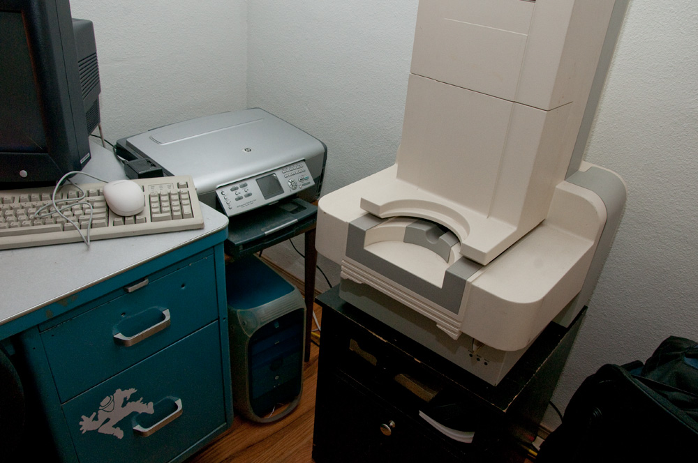 To the right is the LeafScan 45 (not yet functional, waiting on one more cord) and a basic printer…Although the LeafScan was the industry standard for over a decade and is still capable of producing amazing quality scans, it is old technology that requires old technology to run it…