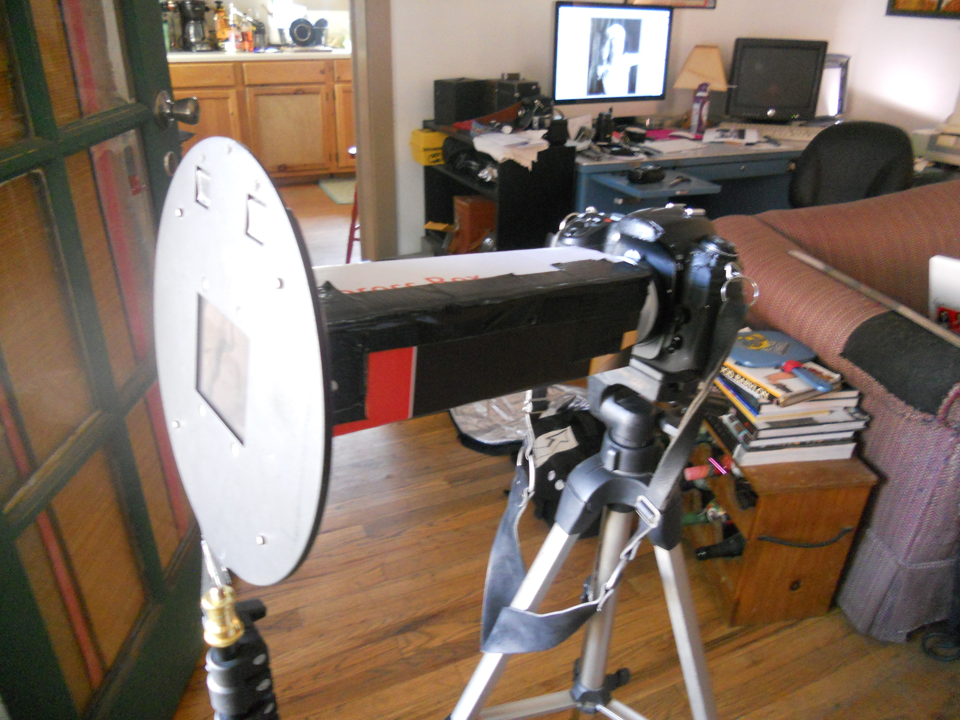 I looked at the design of my film scanner, its a sensor with a bellows a lens and then the negative…not having a bellows attachment for my Nikon I made one out of cardboard and gaff tape, this blocks out all the light except that which enters through the negative. Using a macro lens so I could position the negative as close as possible and a Besler negative carrier attached to a light-stand for stability I pointed it toward a window to act as a back light. To make the window light as even as possible I held a translucent scrim between the window and negative.