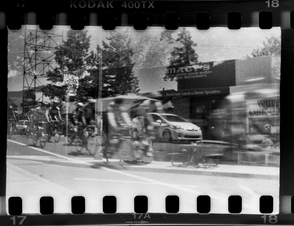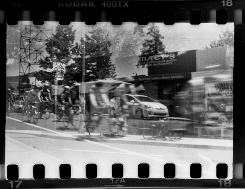 Again, at least two exposures…Both taken from about the same place in front of Macy’s Coffee. One of the front of the building and another of a giant wave of spandex clad bicyclists that rode by…maybe one more?