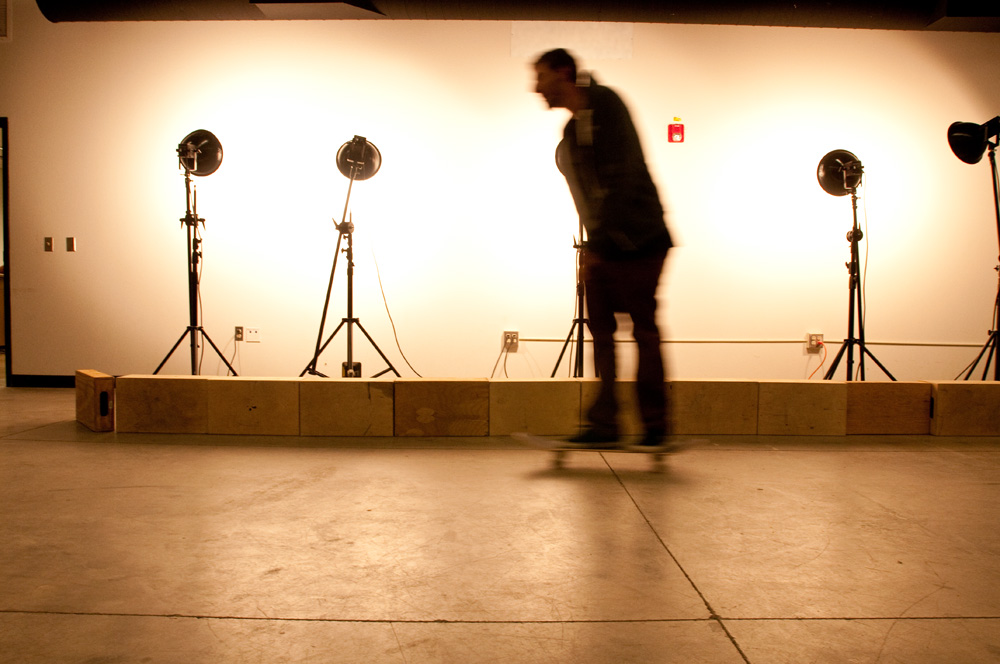 Today in my class we did a demonstration on how to capture motion in photography. I had the students brain-storm the ways to show/shoot motion…Motion Blur, Freeze Action, Panning/Trucking, Zooming, Light-Painting etc. Then we went to the studio and shot some students riding skateboards around the room…