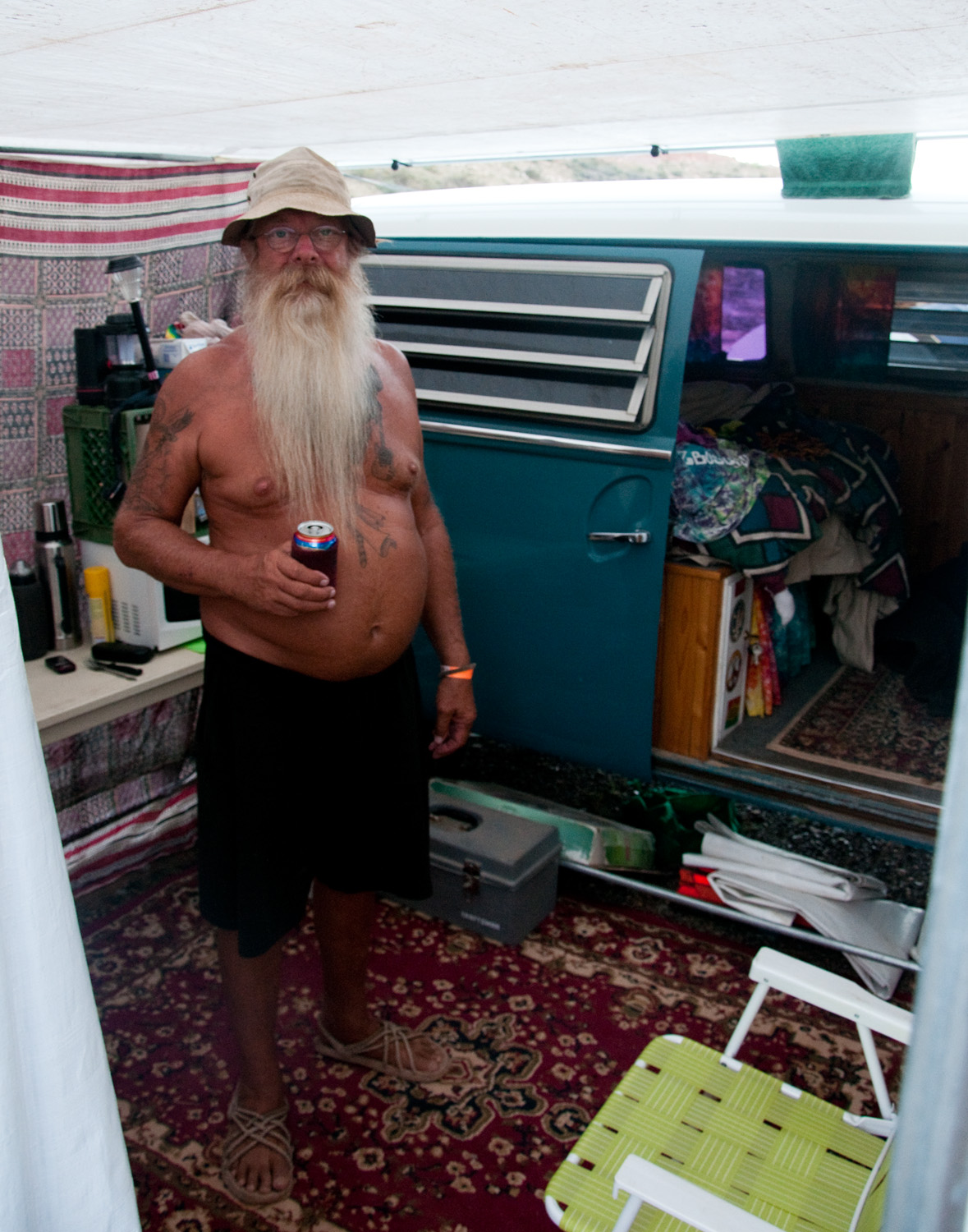 This is Bob, Bob had bitch-tits. (read fight club). In reality…Bob is from Las Cruces, N.M., showen here with Mother Maybell, his 1968 Volkswagon Bus. Bob has owned Mother Maybell for 10 years and lives the rest of the time in a GMC school bus named Walter Mitty.
