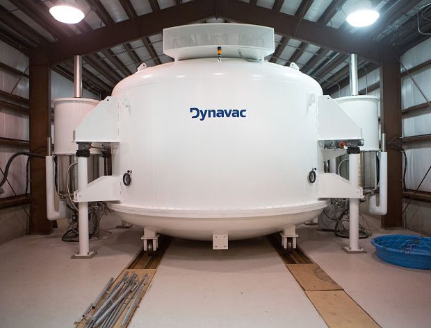 A vacuum tank that is used to coat the mirror of the Discovery Telescope with microscopic aluminum particles stands in a building just behind the main telescope dome. (Taylor Mahoney/Arizona Daily Sun)