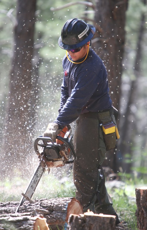 Chris Sanchez, of the Flagstaff Fire Department, cuts a fallen tree into smaller logs while state and city crews work on thinning an area of state land near Woody Mountain Road in Flagstaff. (Taylor Mahoney/Arizona Daily Sun)