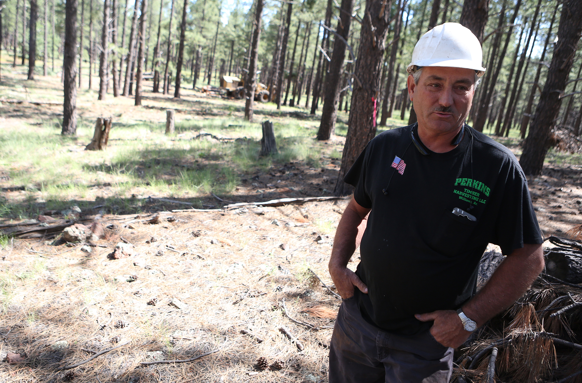 James Perkins, of Perkins Timber Harvesting LLC, stands in an area of state owned Ponderosa forest that his company, in conjunction with city and state fire crews, are working to thin. (Taylor Mahoney/Arizona Daily Sun)