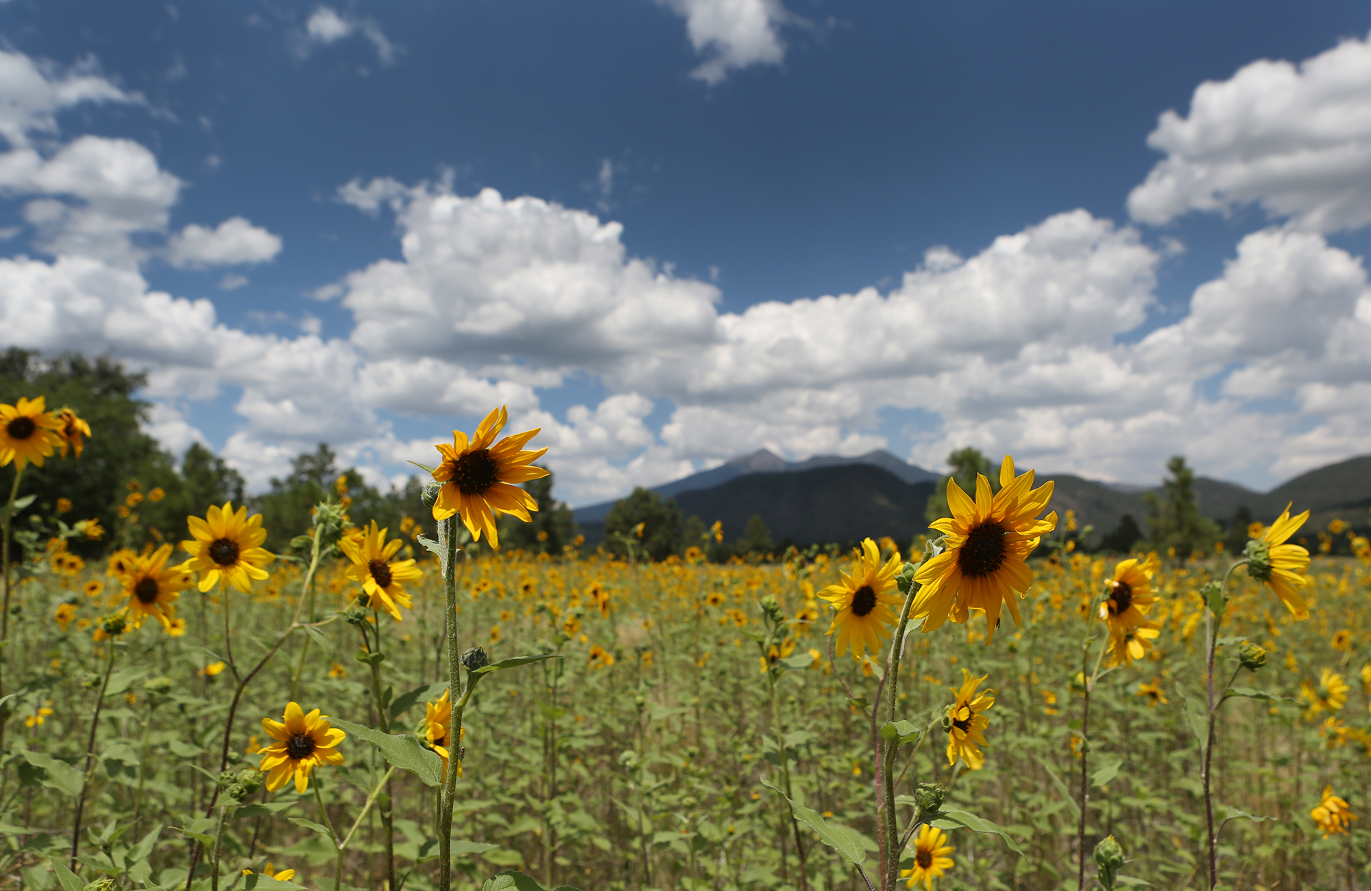 Sunflowers and other wild flowers are in full bloom at Buffalo Park as monsoon clouds hang over the peaks Friday afternoon. (Taylor Mahoney/Arizona Daily Sun)