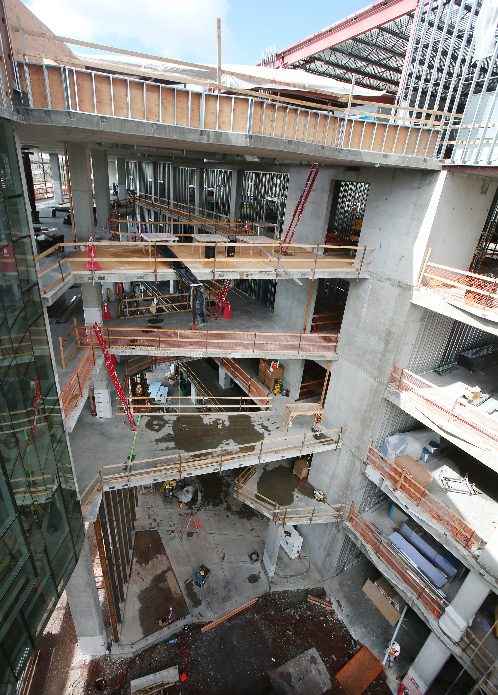 Construction continues on the new Science and Health building on the campus of Northern Arizona University. The $72 million V-shaped building will contain 120,000 square feet on five floors and feature lecture halls, auditoriums, lab and office space and an atrium. It also will have a tunnel and bridge to connect it to the Science Lab facility. (Taylor Mahoney/Arizona Daily Sun)