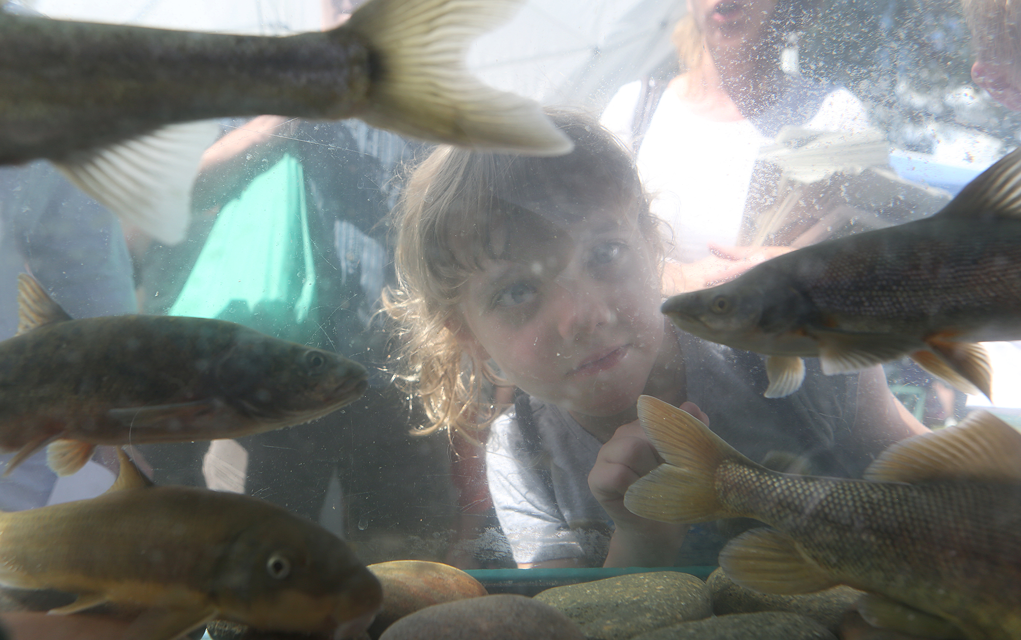 Ada Currant, 6, peers through a tank containing Roundtail Chub and other fish native to Arizona at the USGS booth during Science in the Park Saturday afternoon. The event was part of the 2014 Flagstaff Festival of Science which continues at various venues around Flagstaff today. For more information, including a program of events, visit http://www.scifest.org. (Taylor Mahoney/Arizona Daily Sun)