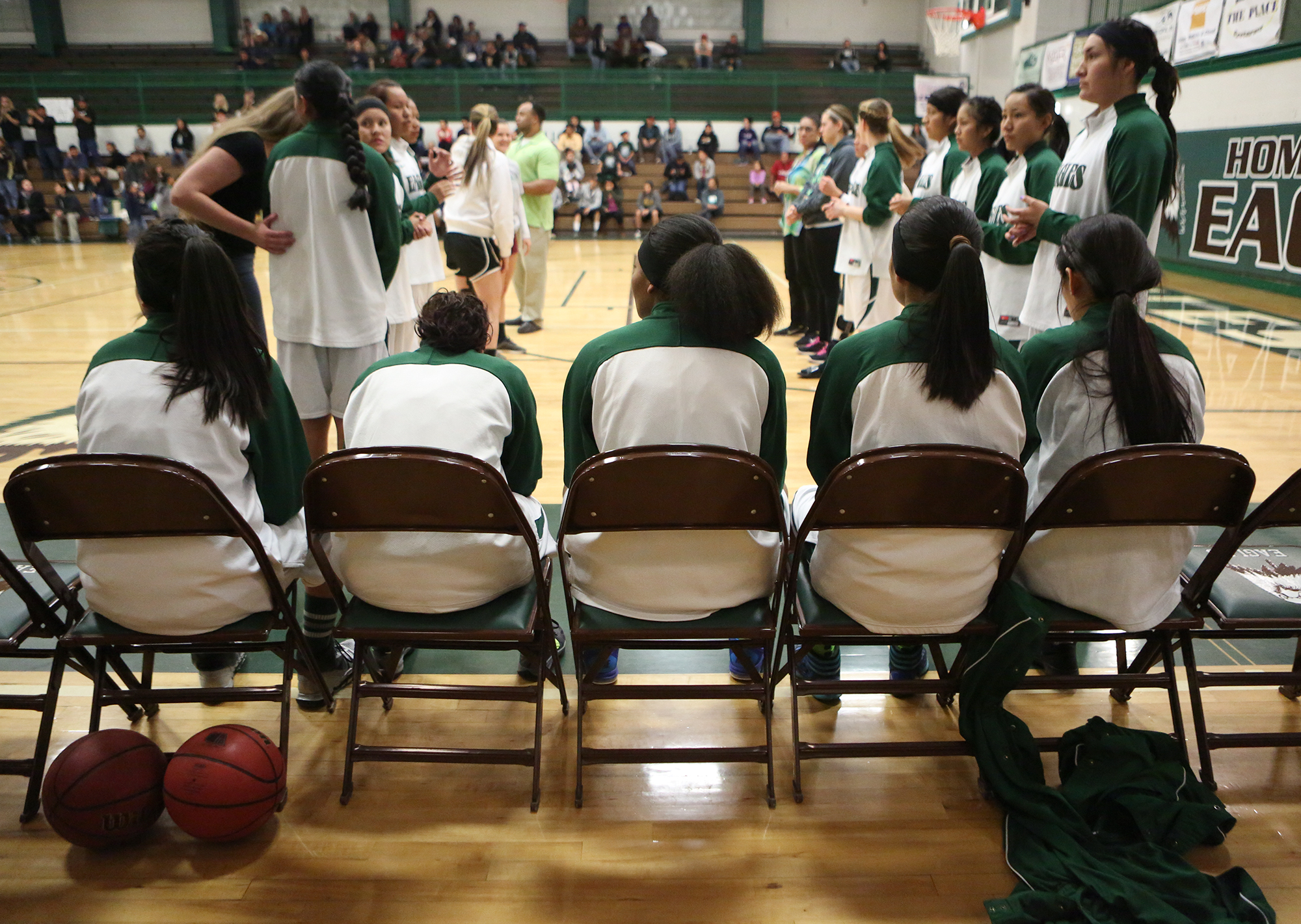 The Flagstaff High School girls basketball starting line up waits for their game against Apache Junction to begin. (Taylor Mahoney/Arizona Daily Sun)