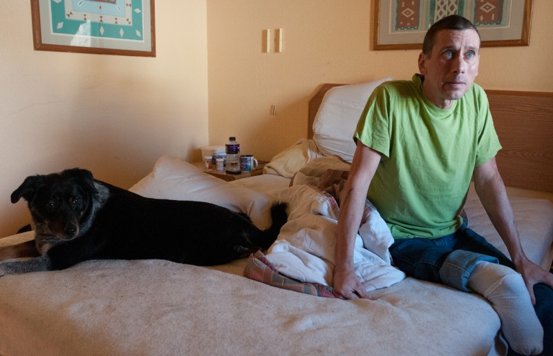 Robert “Bobby” Templin, 52, sits in his motel room in Flagstaff with his dog Geronimo, 4, before moving into an apartment next week. The move was made possible by a grant from the U.S. Department of Veterans Affairs to Catholic Charities. (Taylor Mahoney/Arizona Daily Sun)