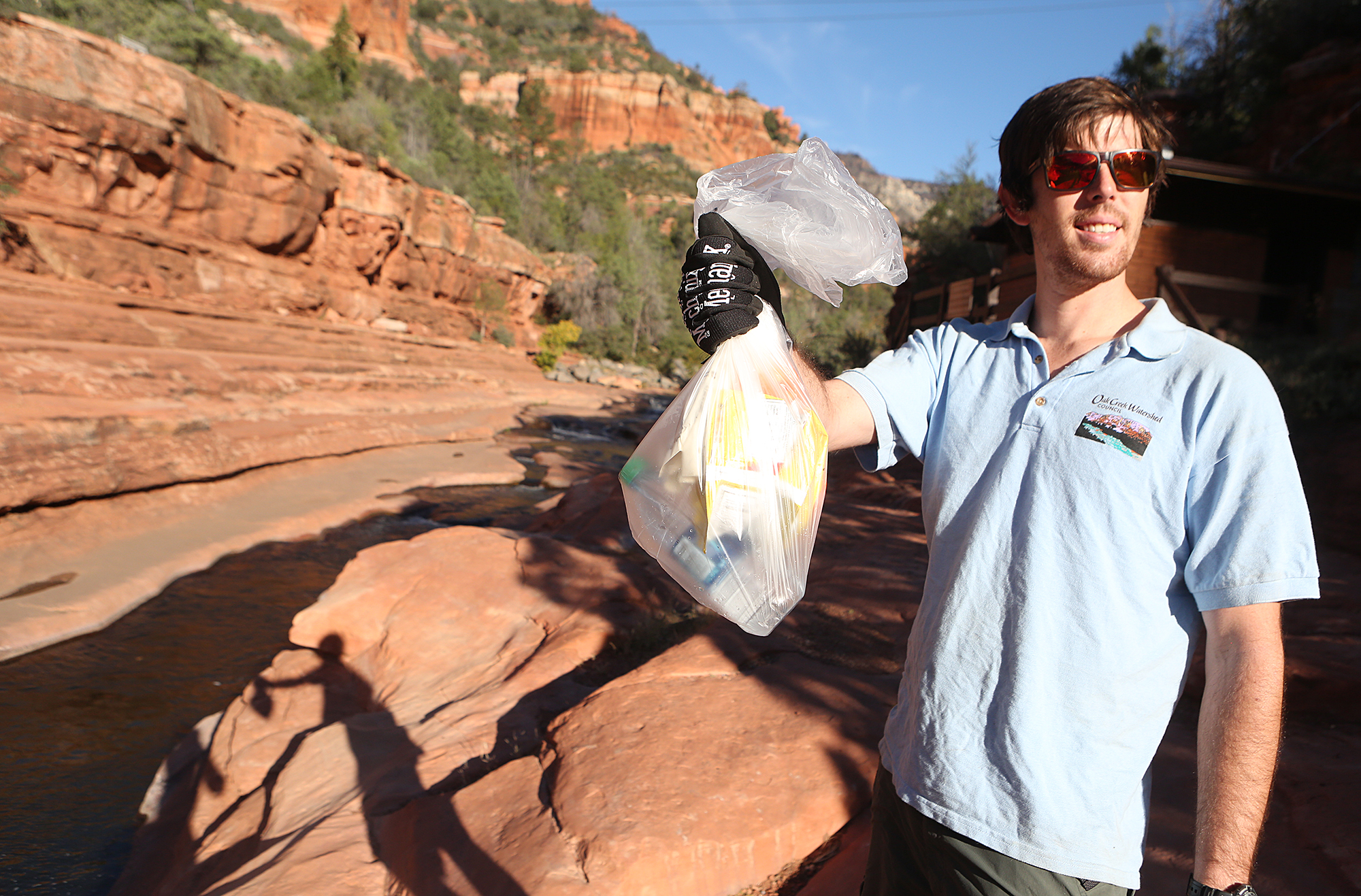 Dalton Zanetti, former Oak Creek Ambassador and Operations Assistant with the Oak Creek Watershed Council, holds up a bag of trash that he collected at Slide Rock State Park Wednesday morning. (Taylor Mahoney/Arizona Daily Sun)