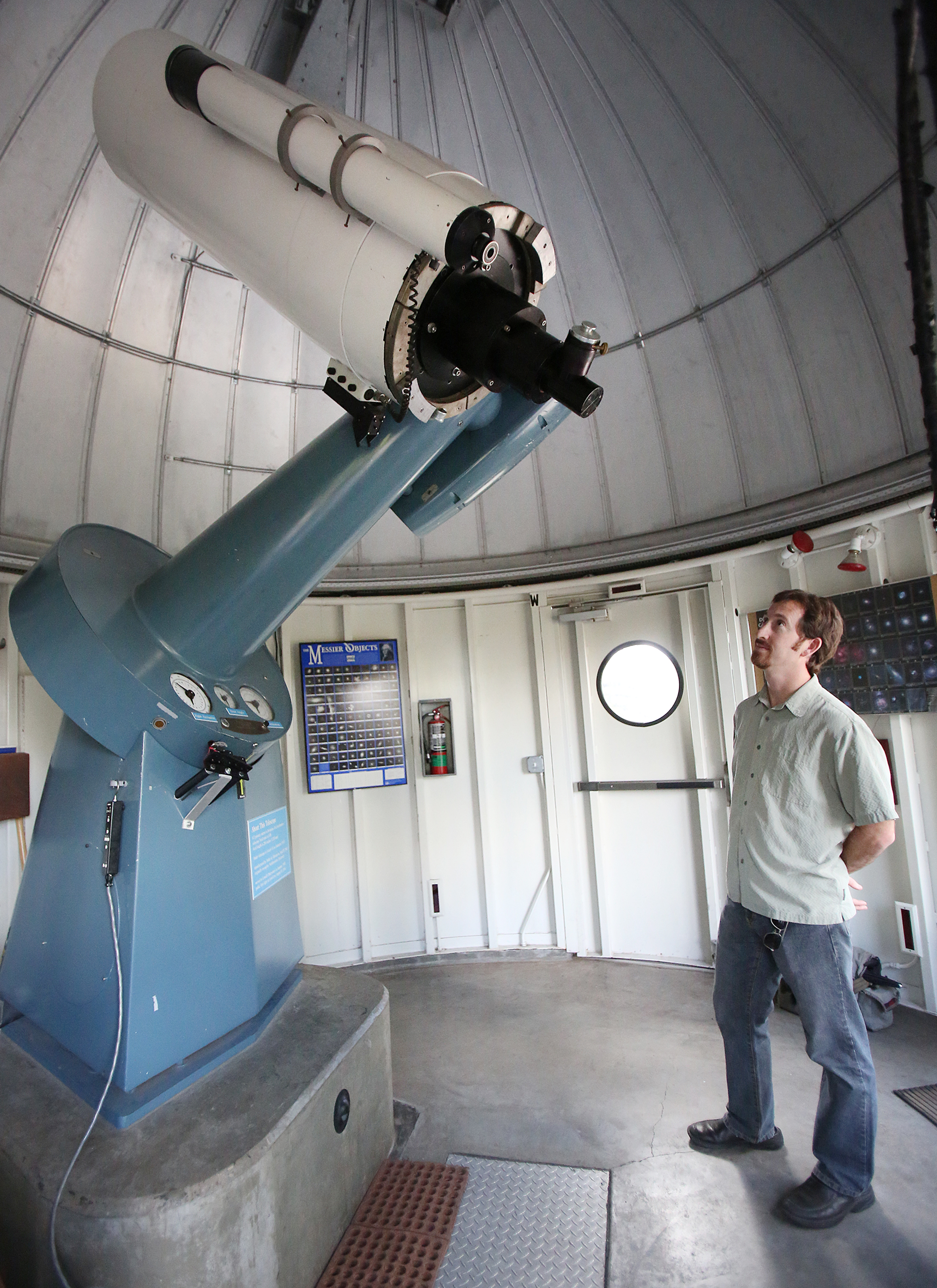 Dr. Nicholas Moskovitz, an Astronomer at Lowell Observatory, looks up at the McAllister telescope, which is used for public star gazing on the Lowell campus in Flagstaff. (Taylor Mahoney/Arizona Daily Sun)