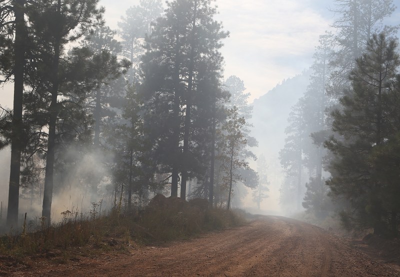 Mount Elden Lookout Road is filled with smoke while local fire crews conducted controlled burn operations in the area Thursday, October 16, 2014. (Taylor Mahoney/Arizona Daily Sun)