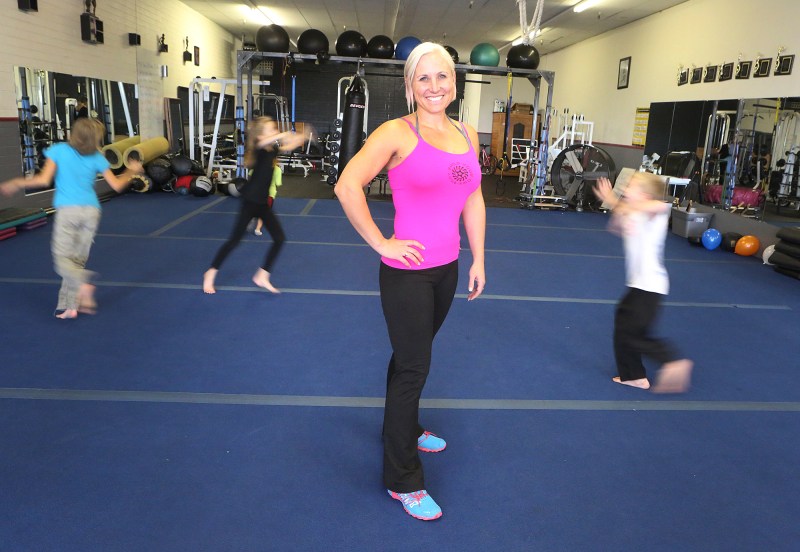 Sarah Pawlicki, owner of Build Your Own Body gym, stands in the workout room while children enrolled in her Superheroes workout class for kids run about behind her. (Taylor Mahoney/Arizona Daily Sun)