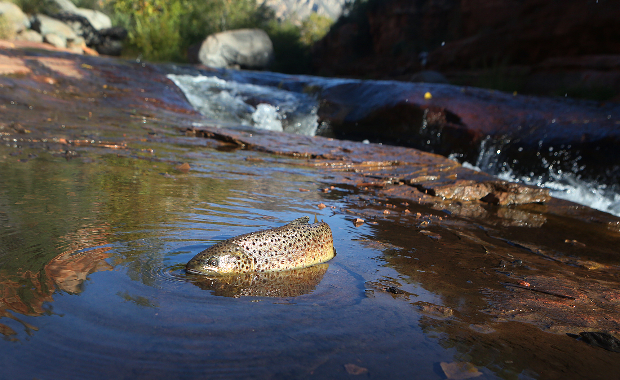 A live Rainbow Trout that jumped out of the main stream, sits in a small pool on the banks of Oak Creek at Slide Rock State Park. The fish flopped back into the creek and swam away moments later. (Taylor Mahoney/Arizona Daily Sun)