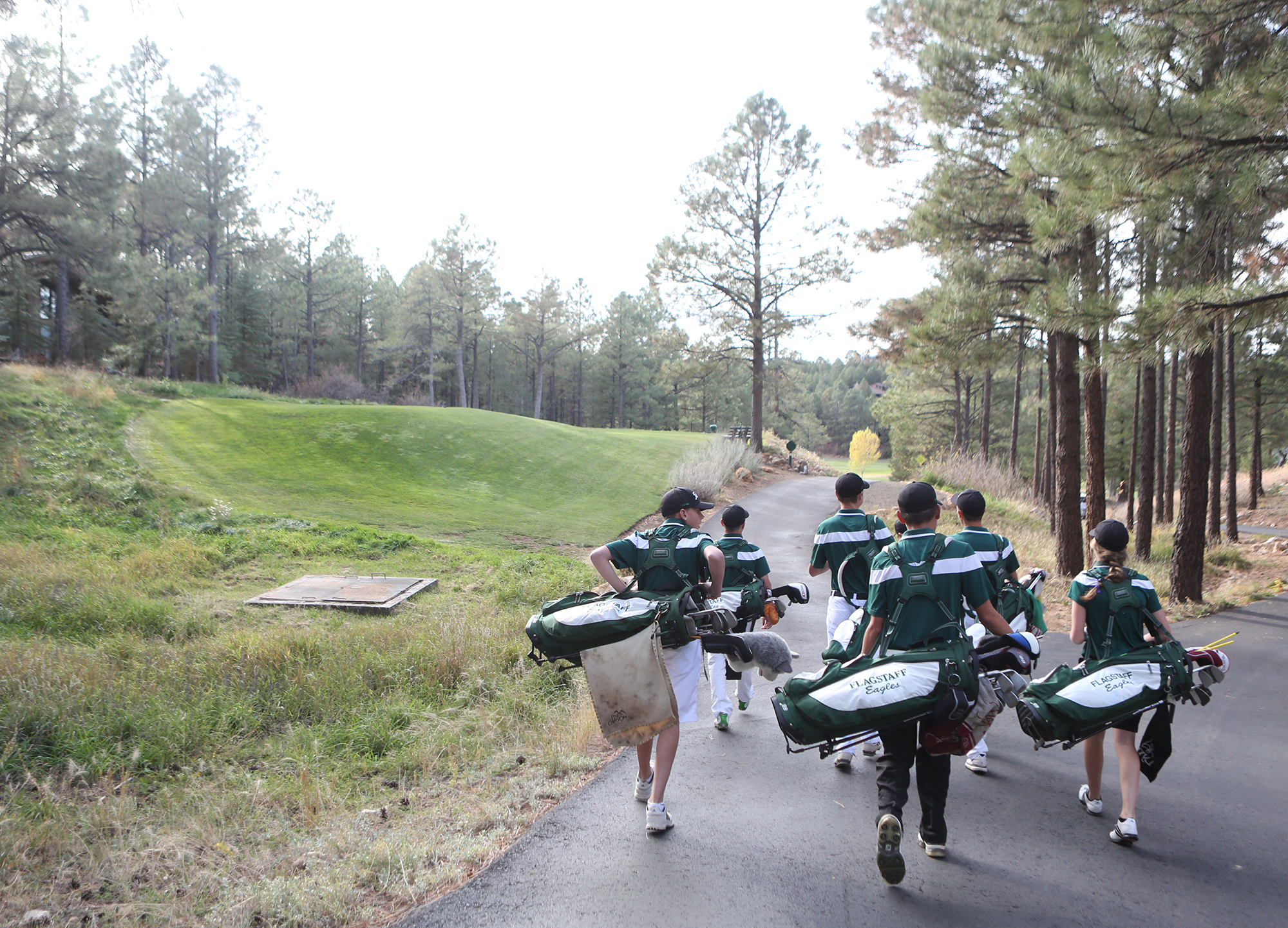 The Flagstaff High School golf team walks to toward the first tee during practice at the Aspen Valley Golf Club. (Taylor Mahoney/Arizona Daily Sun)