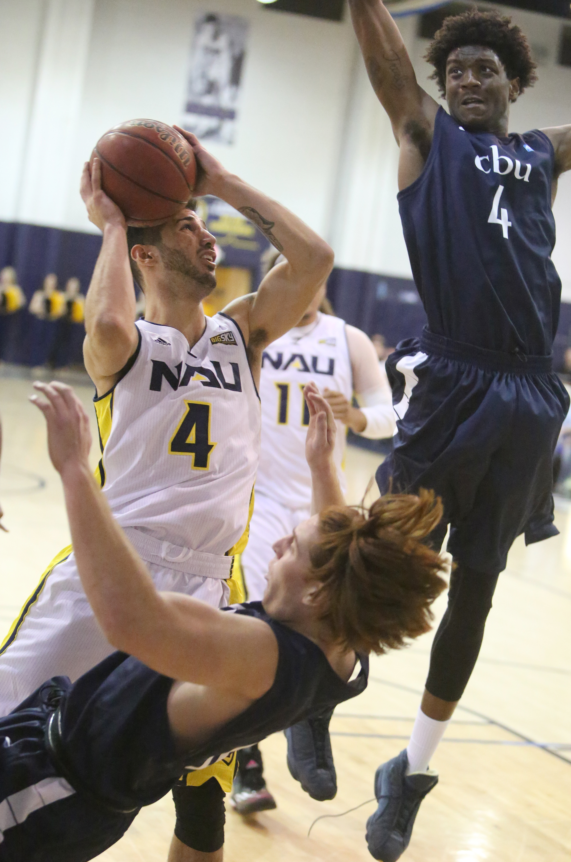 NAU’s Kris Yanku (4) plows through a California Baptists player on his way to a layup during an exhibition game Wednesday. (Taylor Mahoney/Arizona Daily Sun)