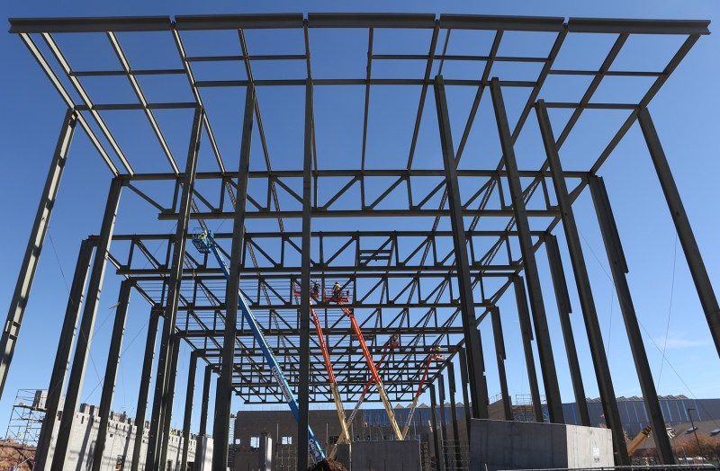 Construction continues on the new Center for Aquatics and Tennis building as crews work on the metal frame of the building this week at Northern Arizona University. (Taylor Mahoney/Arizona Daily Sun)