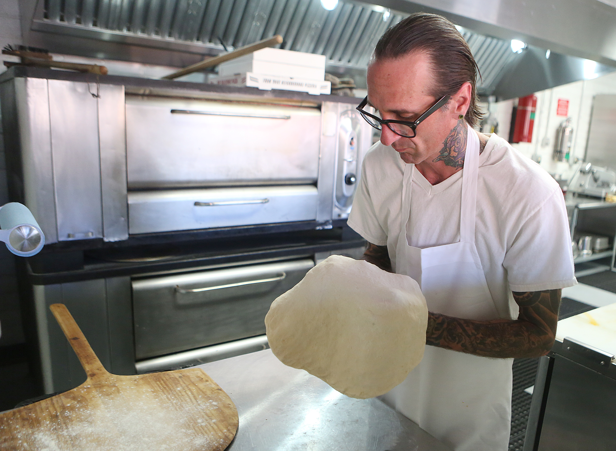 Owner Bob Verderame hand tosses dough as he prepared the crust for one of his speciality pizzas at Il Rosso Italiane in Downtown Flagstaff. (Taylor Mahoney/Arizona Daily Sun)