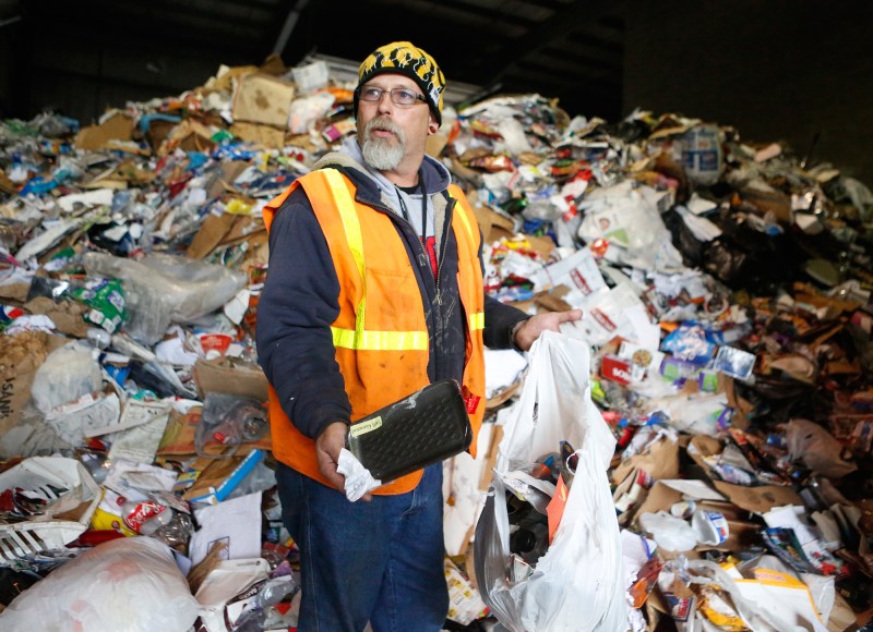 Norton environmental Maintenance Manager David Parbil holds up a styrofoam plate near the intake area of the Flagstaff recycling plant. Styrofoam as well as many plastic items, including plastic bags, are not recyclable and can cause major problems for the machinery at the plant. (Taylor Mahoney/Arizona Daily Sun)