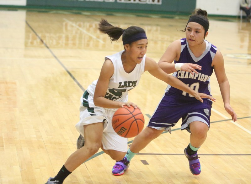 Monique Ware (52) pushes past a Cesar Chavez High School defender on her way to the basket Friday night at the Pepsi Tournament. (Taylor Mahoney/Arizona Daily Sun)