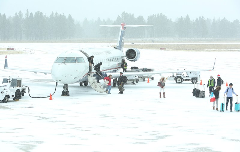 A US Airways flight disembarks on a snowy Christmas morning at the Flagstaff Pulliam Airport. (Taylor Mahoney/Arizona Daily Sun)