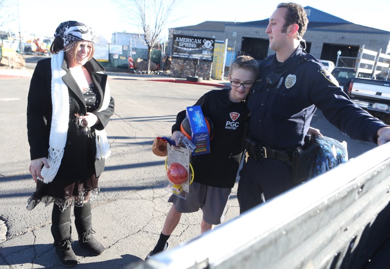 Colton Dana, 13, and his mother Jody Dana thank Flagstaff Police Officer Ryan Forsman after receiving their toy donations from the Northern Arizona Law Enforcement Toy Drive Monday afternoon. (Taylor Mahoney/Arizona Daily Sun)