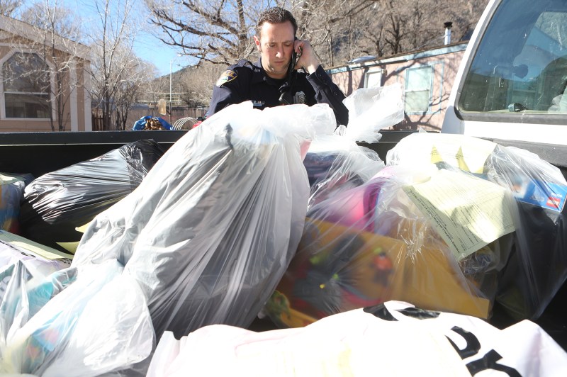 Flagstaff Police Officer Ryan Forsman, standing over a full truck of toys, talks to dispatch on his cell phone while trying to locate the address of a child who was nominated to receive a toy bag from the annual Northern Arizoan Law Enforcement Toy Drive. (Taylor Mahoney/Arizona Daily Sun)