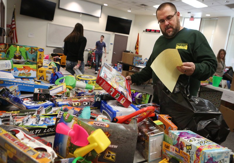 Coconino County Sheriff’s office volunteer Tony Bond, fills a bag with toys which will be given to children in the community that have been nominated by school officials or law enforcement personal for the annual Northern Arizona Law Enforcement Toy Drive. (Taylor Mahoney/Arizona Daily Sun)