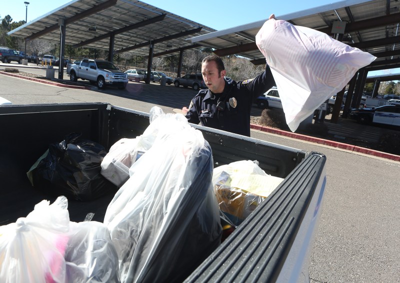 Officer Forsman loads a police truck full of gift bags for children around Flagstaff. The children are nominated by school officials or law enforcement personal to be part of the annual Northern Arizona Law Enforcement Toy Drive. (Taylor Mahoney/Arizona Daily Sun)