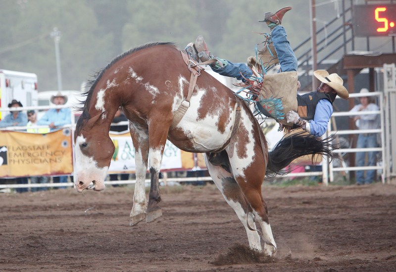 Tolman Moore of Las Cruces, N.M. is tossed from his horse during the bareback bronc riding competition at the Flagstaff Pro Rodeo Thursday evening.