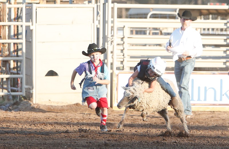 A young participant holds on tight during the mutton busting competition at the Flagstaff Pro Rodeo Thursday evening.