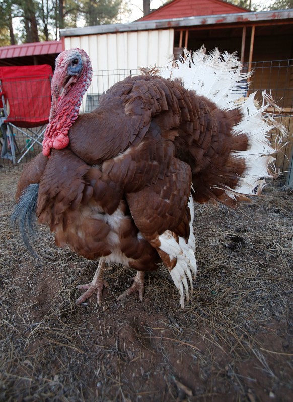 Thor a heritage breed Bourbon Red turkey struts around the Star Spangled Acres Petting Zoo at the Flagstaff Pro Rodeo.