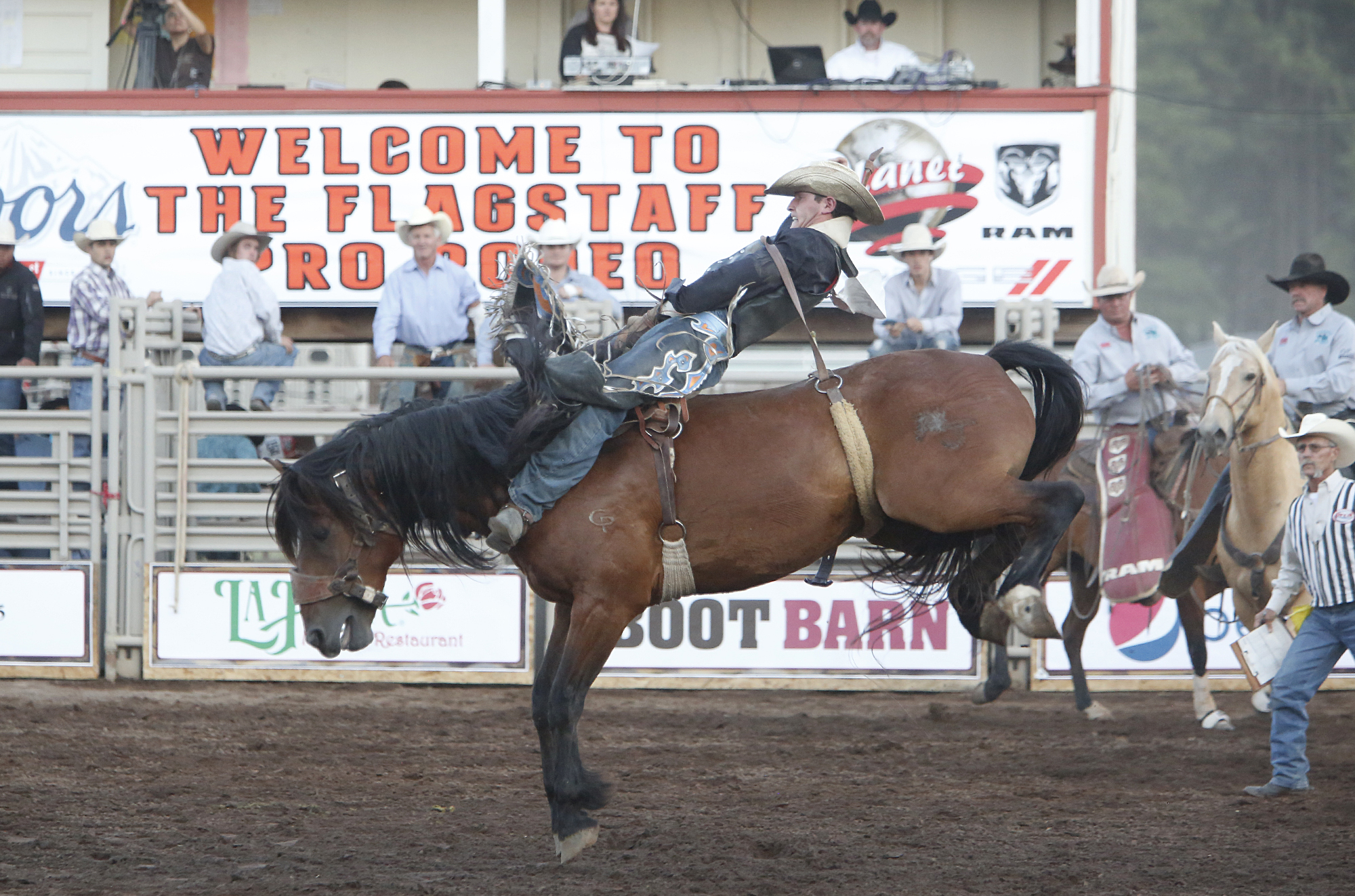 Trenten Montero of Winnemucca, Nev. competes in the bareback bronc riding competition at the Flagstaff Pro Rodeo Thursday evening.