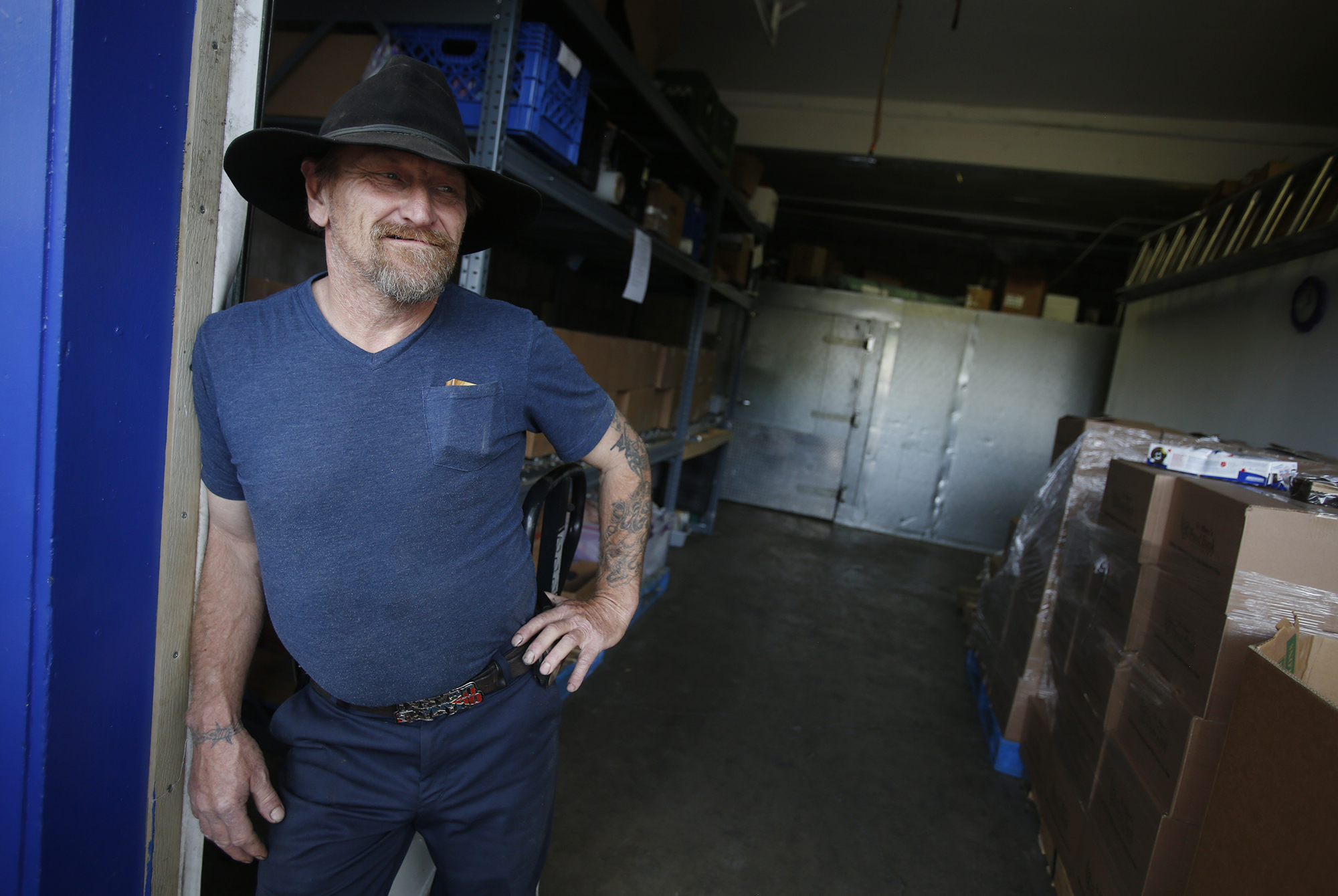 Howard McAnly, a volunteer at the Flagstaff Family Food Center, waits for customers to arrive to collect their donated food boxes.