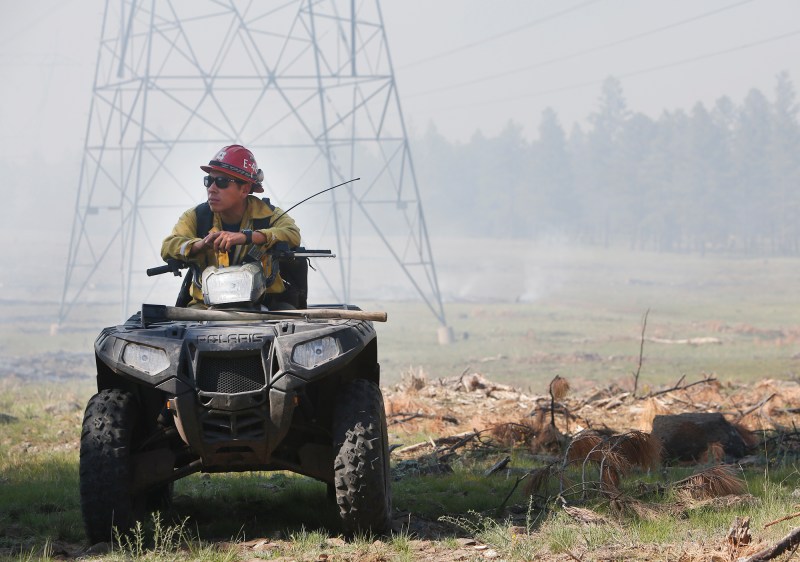 A firefighter with the Coconino National Forest sits near large power lines while monitoring a managed fire operation near Mormon Lake Wednesday afternoon.
