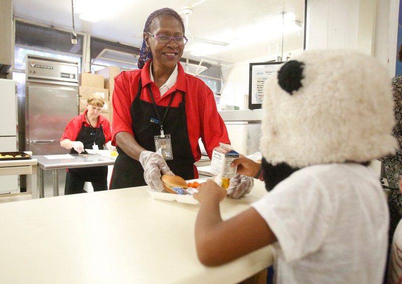 Debbie Johns hands out dinner trays to students at Killip Elementary in Flagstaff.