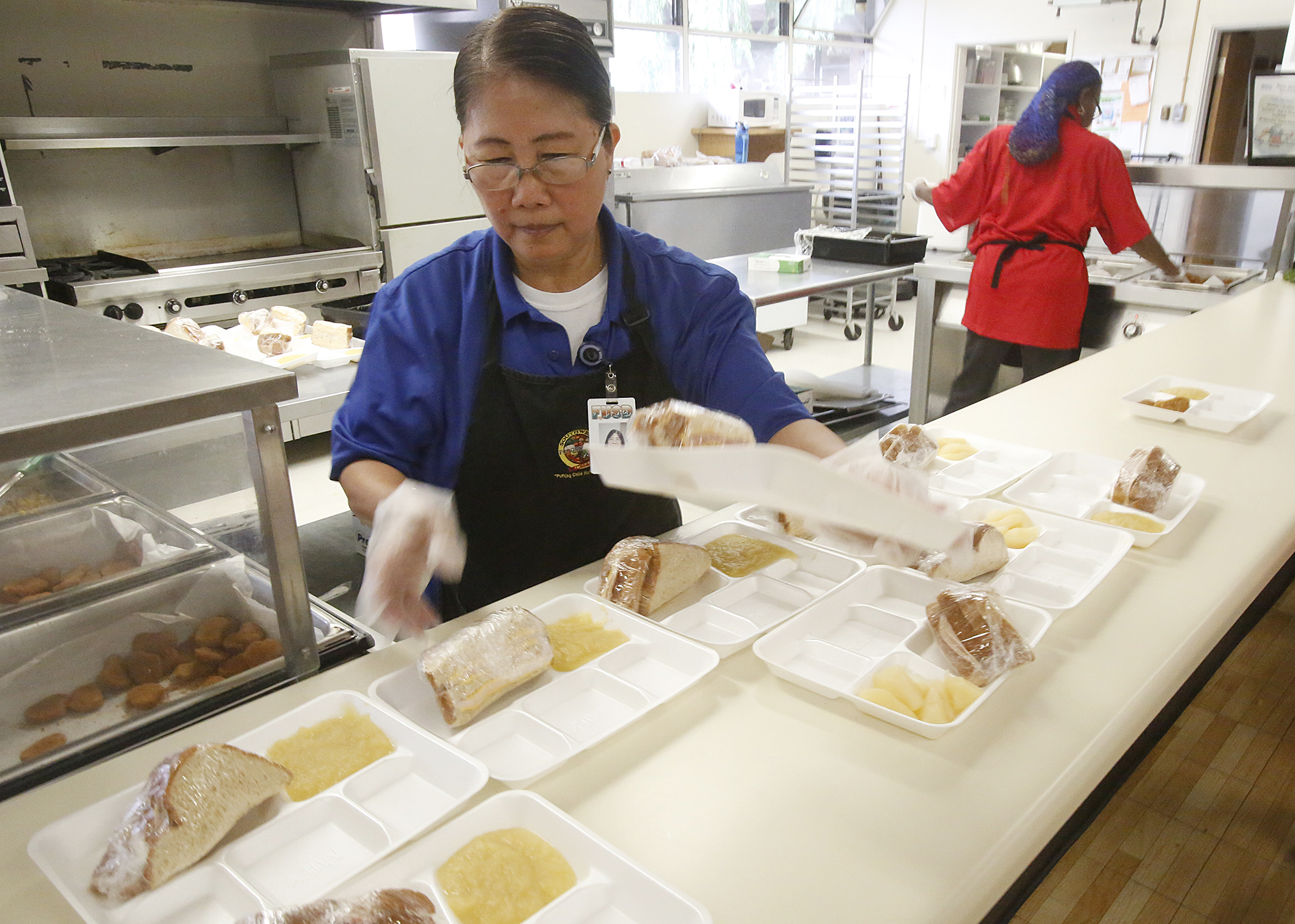 Carolina Medrano lines up trays of sandwiches for students during the lunch hour at Killip Elementary in Flagstaff.