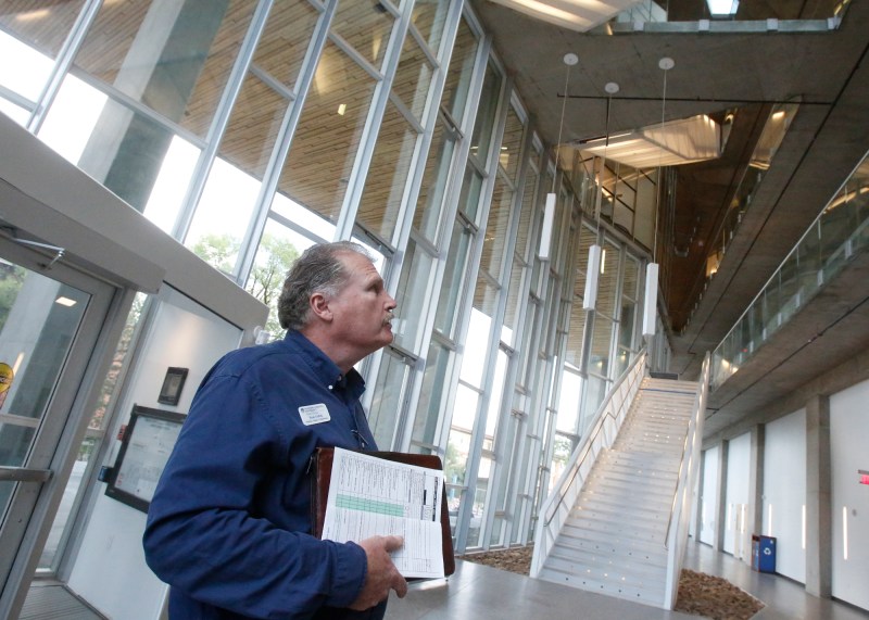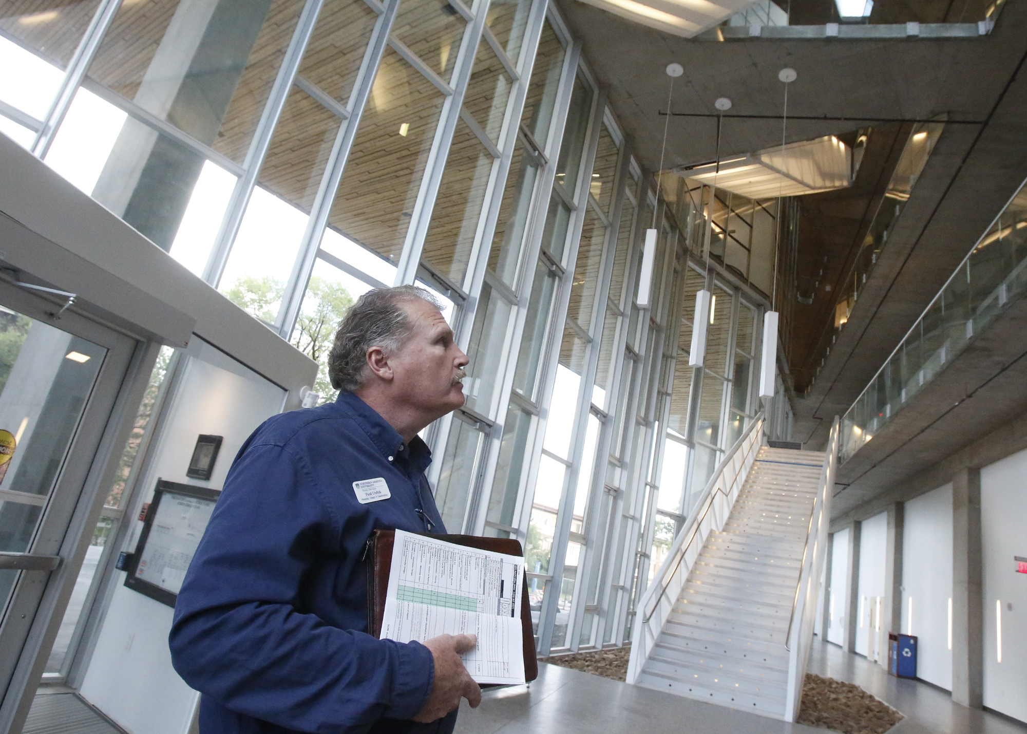 Paul Defek, Project Manager at Northern Arizona University for the new Science and Health building, looks up through the five-story atrium from the main entrance of the recently completed building.