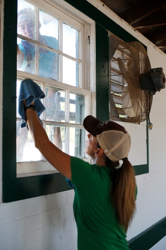 Tandy Drye, right, and Lydia Peterson, left, work to clean the windows of one of the many 4-H Club animal barns ahead of the Coconino County Fair.