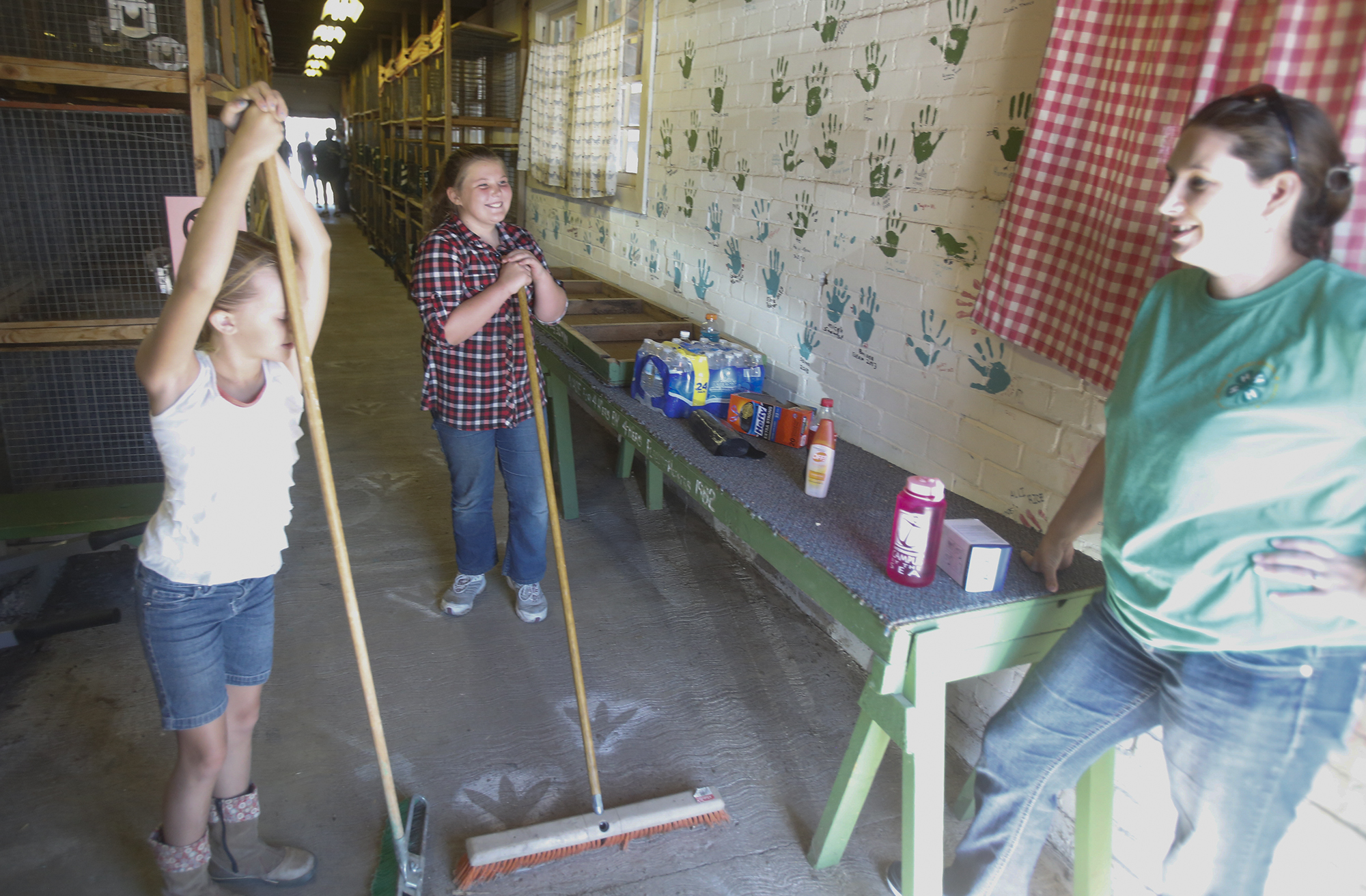 Marybeth Jones, 9, left, takes a break from sweeping the 4-H Club poultry barn at the county fairgrounds with her sister Lillyanne Jones, 11, while their mother Christie Jones, right, looks on.