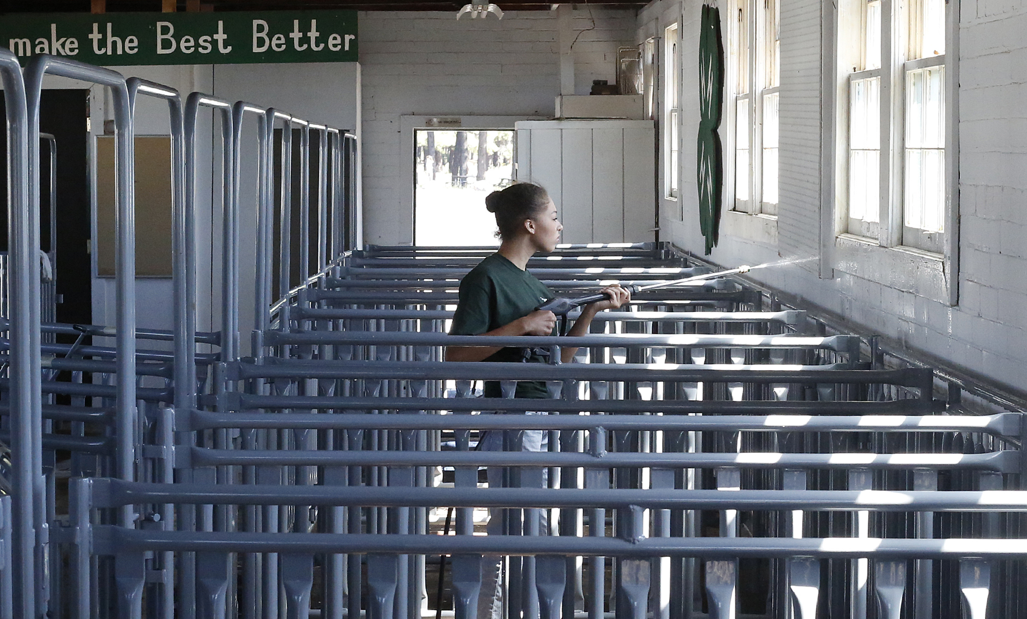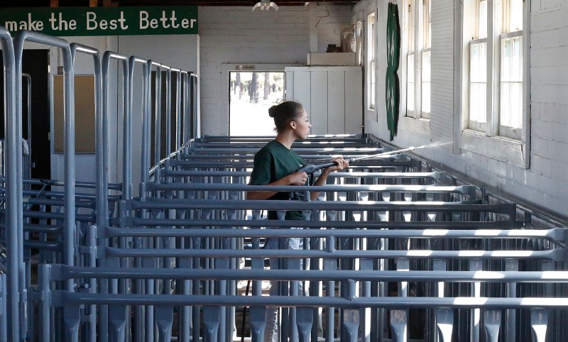 Shayla Maclin, 17, uses a pressure washer to clean pens at the county fairgrounds that will hold goats she and other 4-H club members have raised. The Coconino County Fair will is scheduled for September 4-6 at Fort Tuthill County Park.