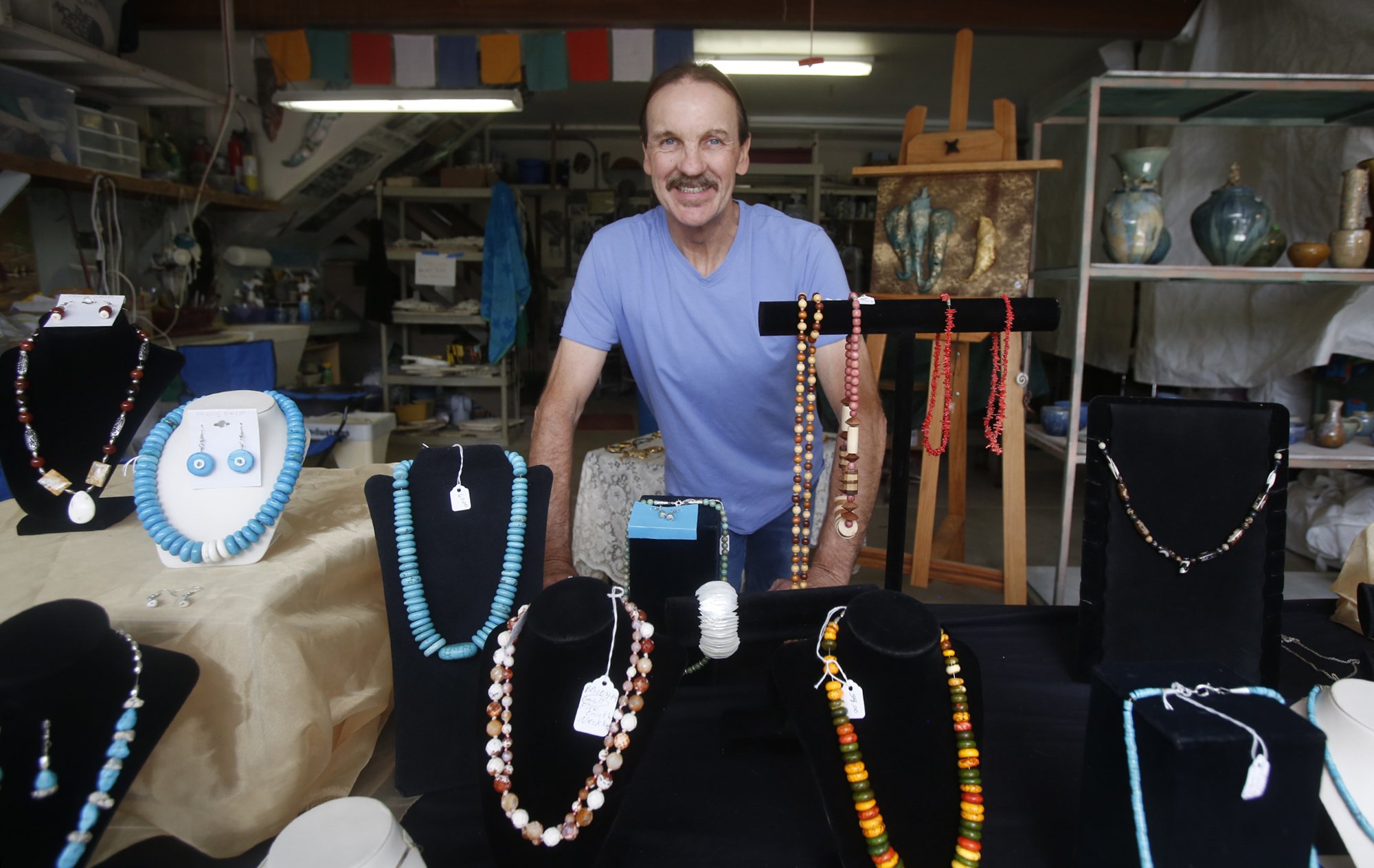 Local jewelry maker Billy Bob Vaughan stands with some of his creations at his home during the annual Flagstaff Open Studios Saturday.