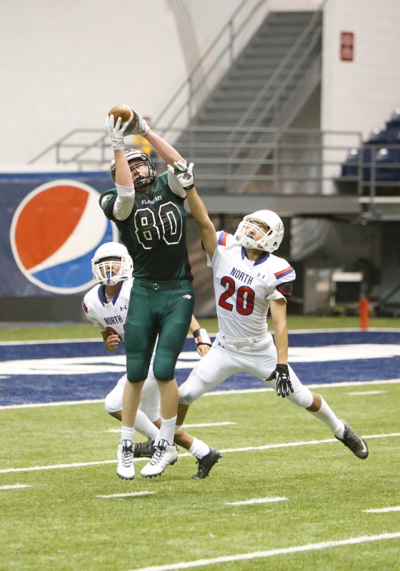 Flagstaff High School running back C.J. Tompkins (80) jumps to complete a pass during game action against North High School Friday night.