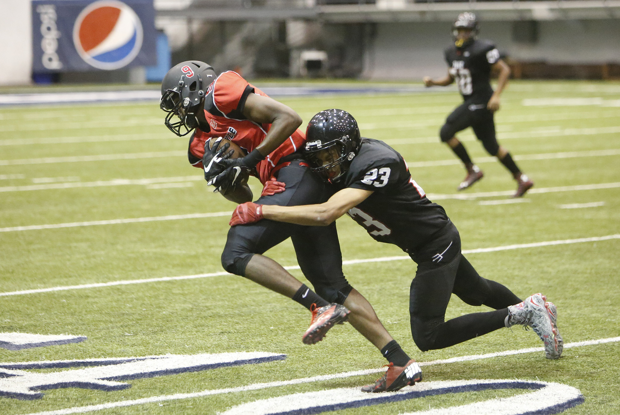 Kirk Benally (23) of Page High School grabs onto a Florence High player for a tackle during game action Saturday.