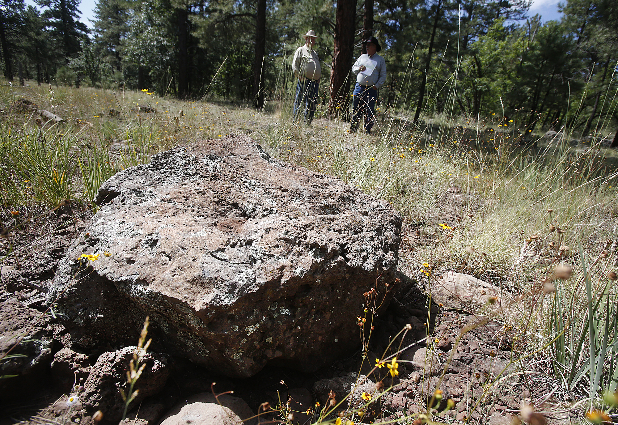 A large chunk of basalt sits in a forested area near Parks, Ariz. on the site of a proposed gravel mine. The sale of the land for mining is opposed by many area residents.