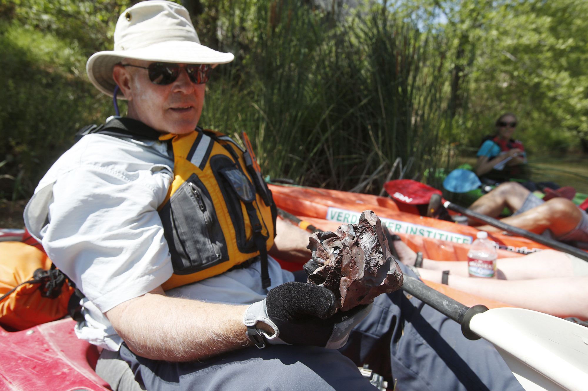 Justin Brown kayaks past a slag pile that contains the remnants of the copper smelting operations that used to be located in the town of Clarkdale. The 20 million-ton pile spills into the Verde River.