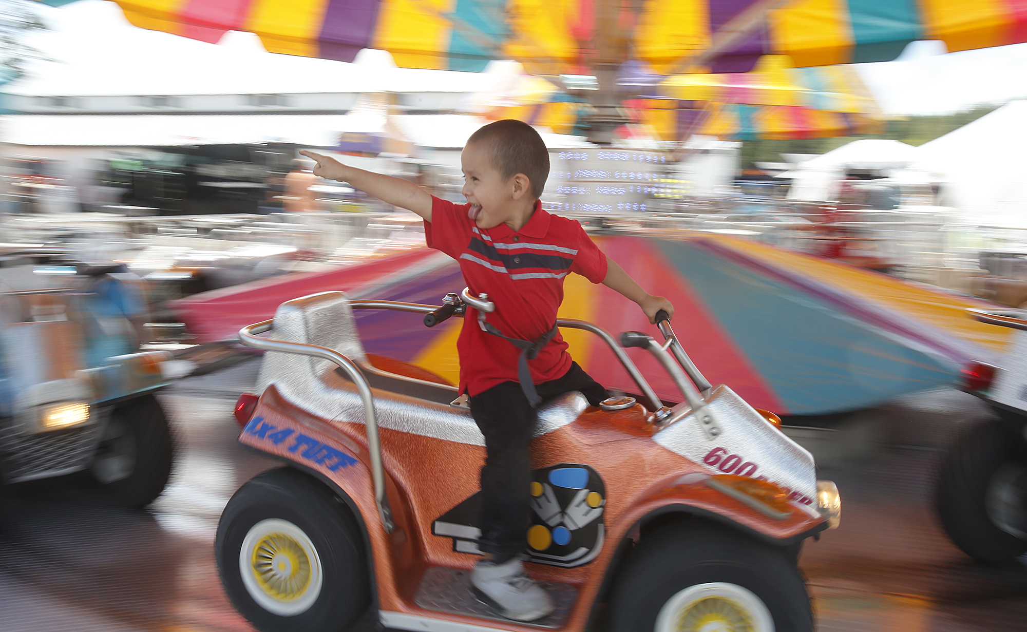 Nathan Riggs, 3, from Leupp, waves to his parents as he flies past on a carnival ride at the Coconino County Fair Friday morning.