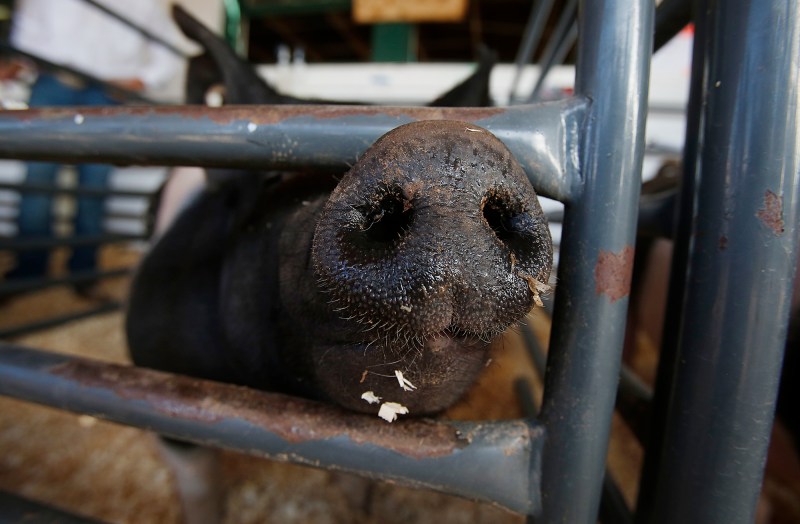 A show pig sticks it’s snout through a pen at a 4-H Club barn at the Coconino County Fair Friday.